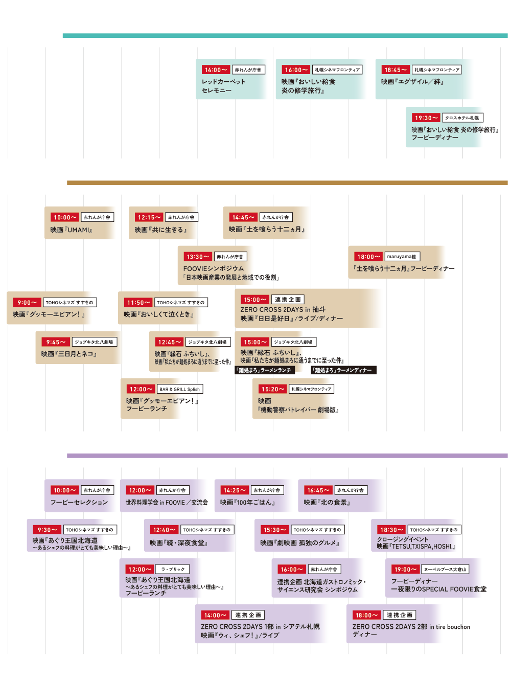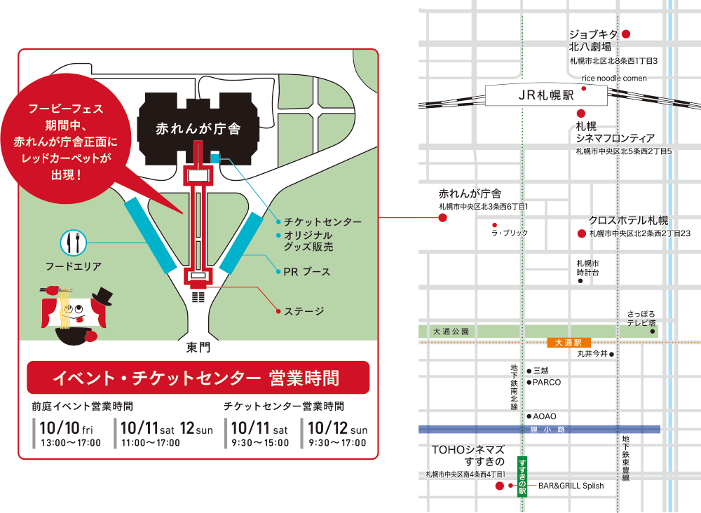 食べものが出てきた映画を観て、お腹が空いたアナタ!ぜひ、グルメあふれる「赤れんが会場」 へ遊びにきて! フービーのパートナー企業が、いろいろな試食や試飲、おいしい商品をそろえて待ってるよ! 人気のキッチンカーやビール・ワインなどドリンクもあるので、たくさん食べて飲んで、一緒に 盛り上がろう!
